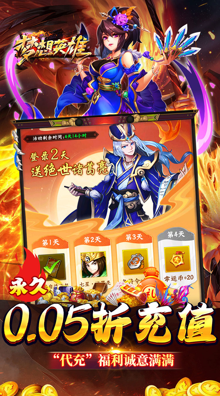 《梦想英雄》是一款全新三国题材策略卡牌手游,真实还原剧情,争霸天下,攻城掠阵,融入众多历史名城以及经典战役元素,超然万物的名将助您角逐三国之巅。0.05折的价格,升级即可领取代金券,更有海量福利,丰富活动,等主公您体验。畅享无双豪情~